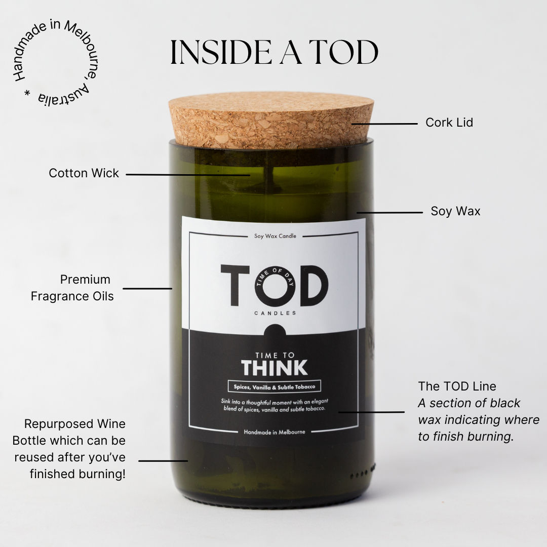 TOD Candles are made from recycled wine bottles. For this reason, each candle is a little different providing elements of distinction and uniqueness… just like you.