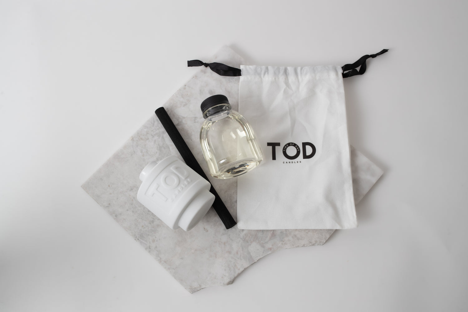 All diffusers are packaged in a cotton bag and placed inside a beautiful TOD Branded Box.