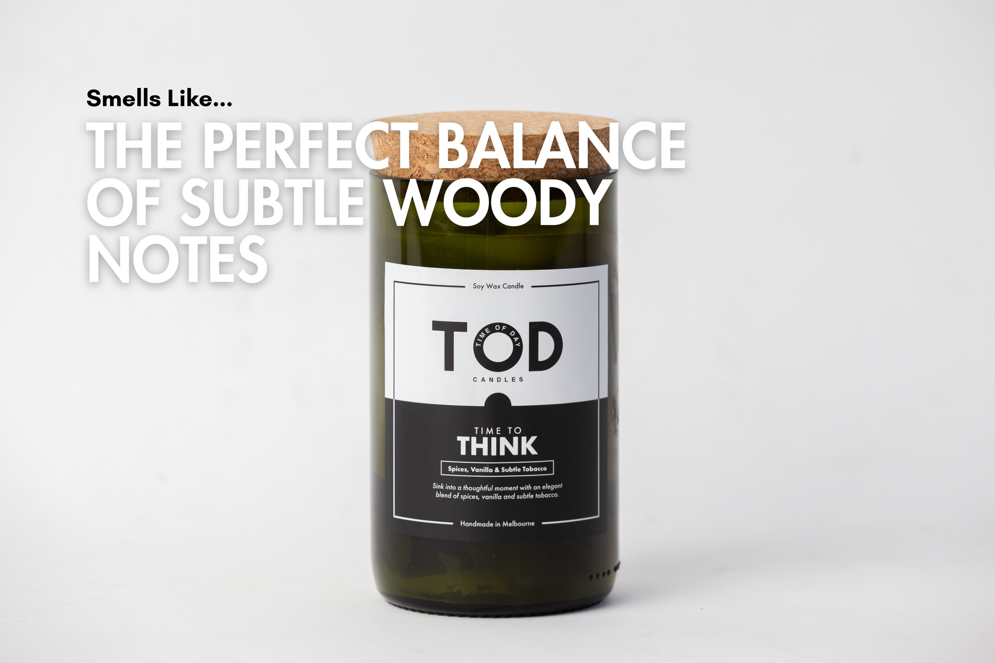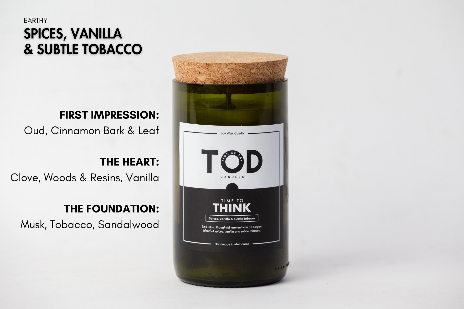 Immerse yourself in the warm, comforting embrace of our Time to THINK scent. The perfect blend of tobacco and vanilla, this scent is ideal for those who appreciate subtle woody notes.
